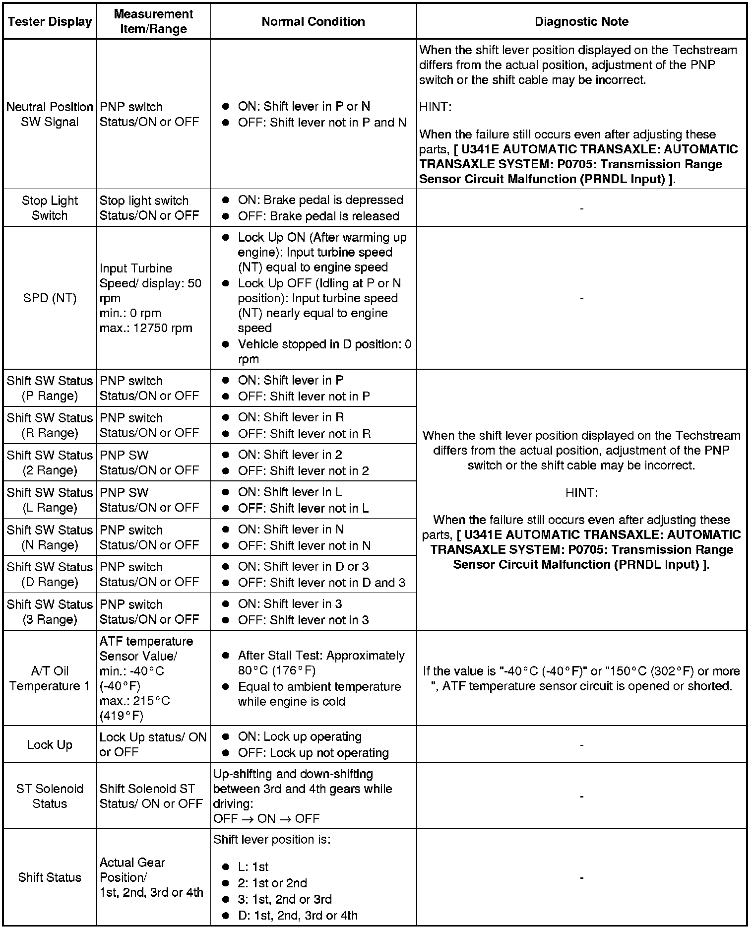 Using a Techstream to read the Data List allows the values or states of switches, sensors, actuators and other items to be read without removing any parts. This non-intrusive inspection can be very useful because intermittent conditions or signals may be discovered before parts or wiring is disturbed. Reading the Data List information early in troubleshooting is one way to save diagnostic time.