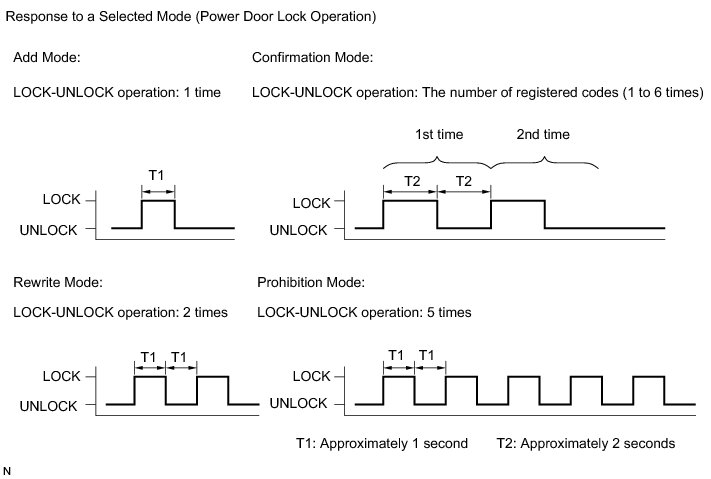 (5) After selecting a mode, the main body ECU automatically performs the power door LOCK- UNLOCK operation within 5 seconds to indicate the selected mode (see the illustration).