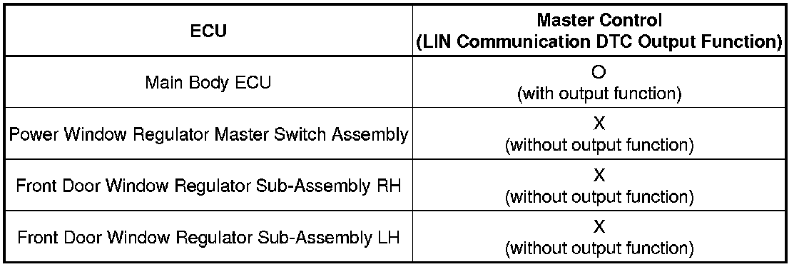 (a) Multiplex communication system using Local Interconnect Network (LIN) communication to control communication between the ECUs of the body system. If communication cannot be performed through LIN because of an open in the communication lines or other reason, the master control ECU of the relevant system will output a DTC. For the communication system and the connected ECUs, refer to the table below.