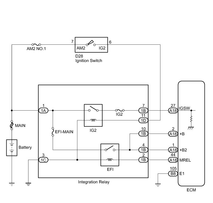 When the ignition switch is turned to ON, the battery voltage is applied to the IGSW terminal of the ECM. The output signal from the MREL terminal of the ECM causes a current to flow to the EFI relay coil, closing the EFI relay contacts and supplying power to terminal +B (+B2) of the ECM.
