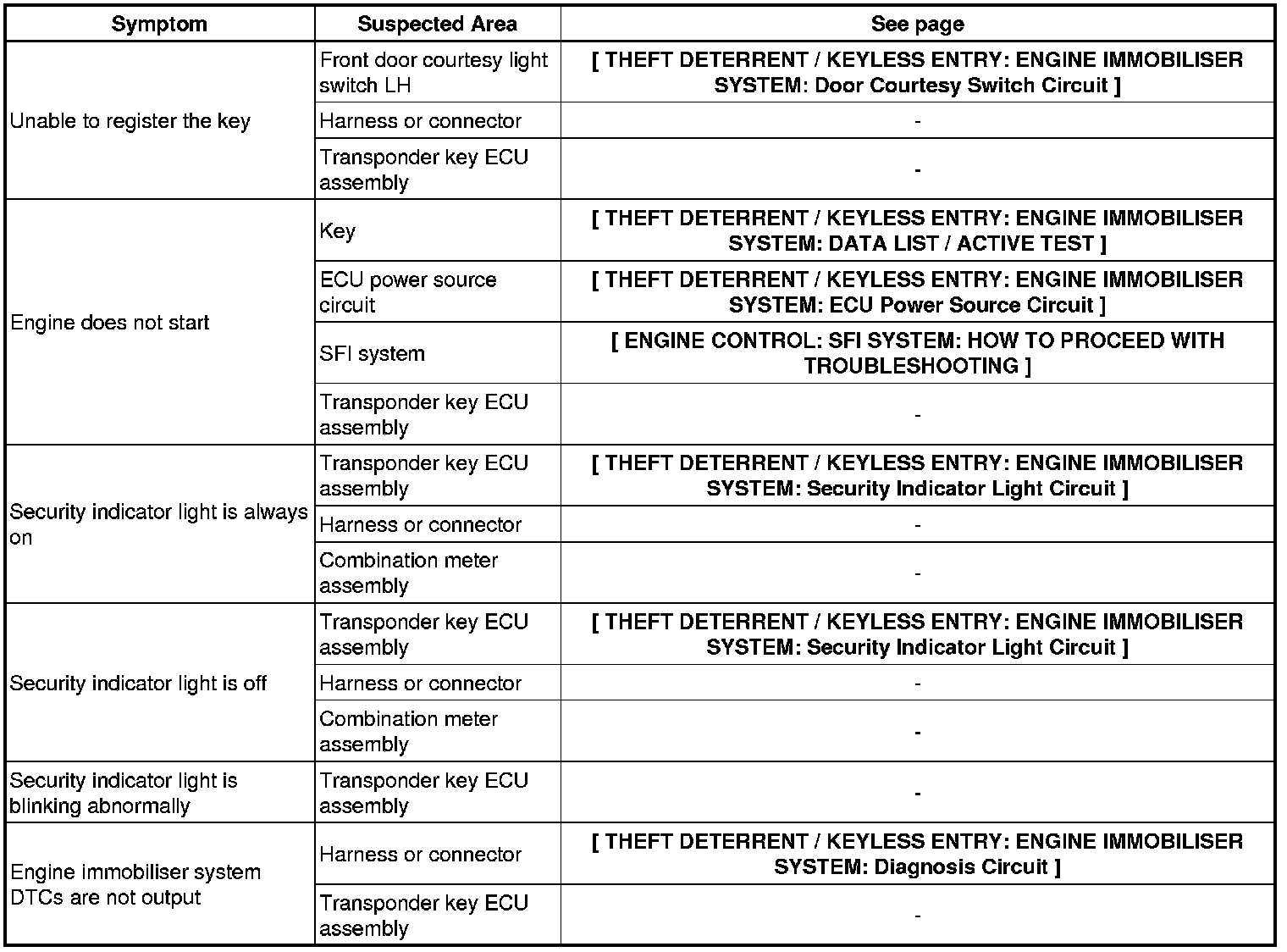 THEFT DETERRENT / KEYLESS ENTRY: ENGINE IMMOBILISER SYSTEM: PROBLEM SYMPTOMS TABLE