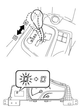 (e) Move the shift lever to D, and then continuously move the shift lever back and forth between N and D at a rate of 1 shift/1.5 seconds or faster for 6 seconds or more. This will activate the fluid temperature detection mode.