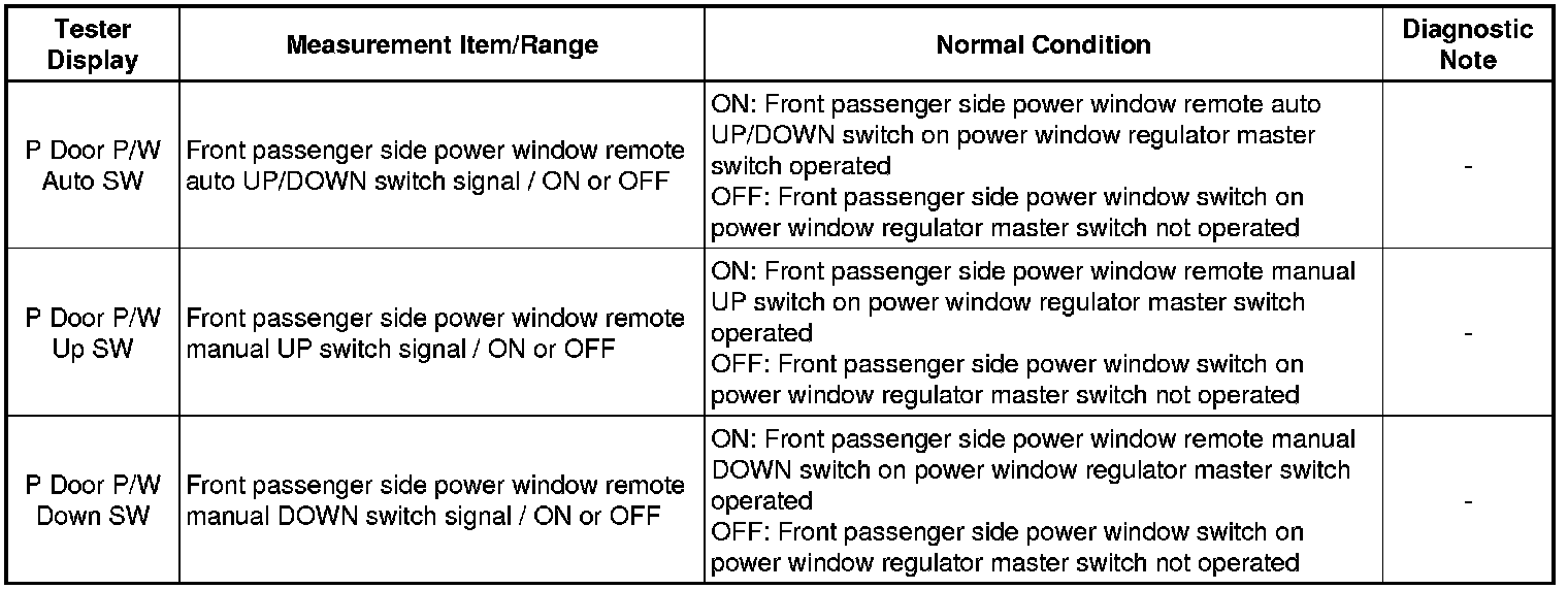 When the ignition switch is ON and the window lock switch is off, the power window regulator master switch sends remote UP/DOWN signals to the front power window regulator motor (passenger side) via the LIN communication line.