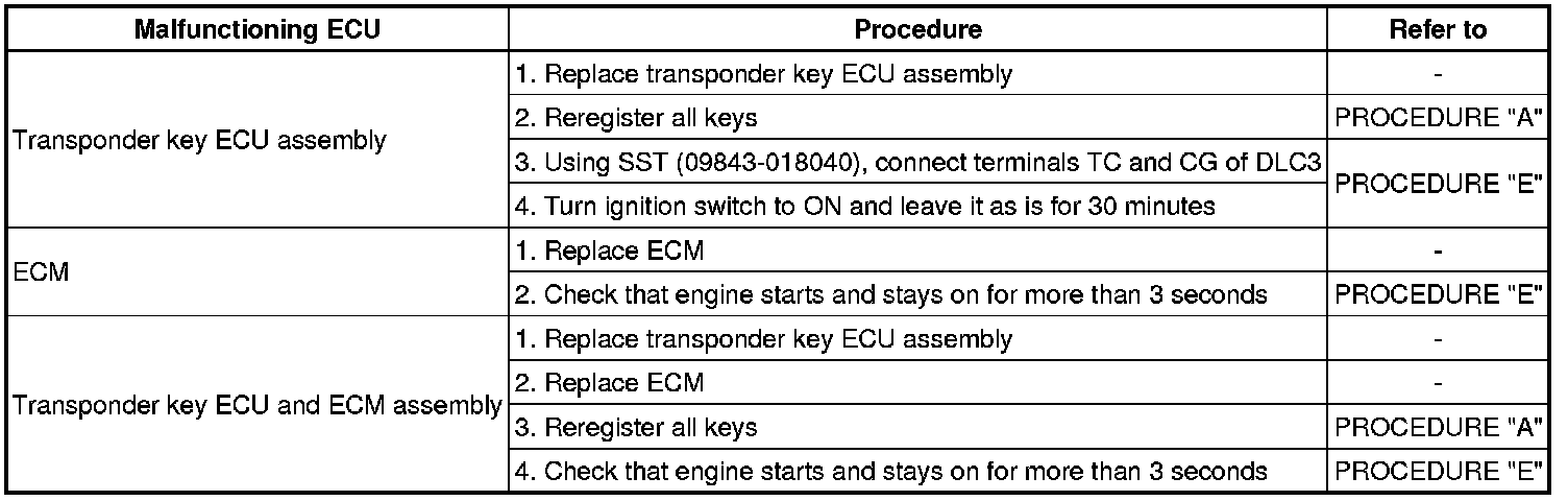 (a) The following table shows ECU replacement and key registration procedures for cases in which the malfunctioning ECU has been determined after troubleshooting the engine immobilizer system.