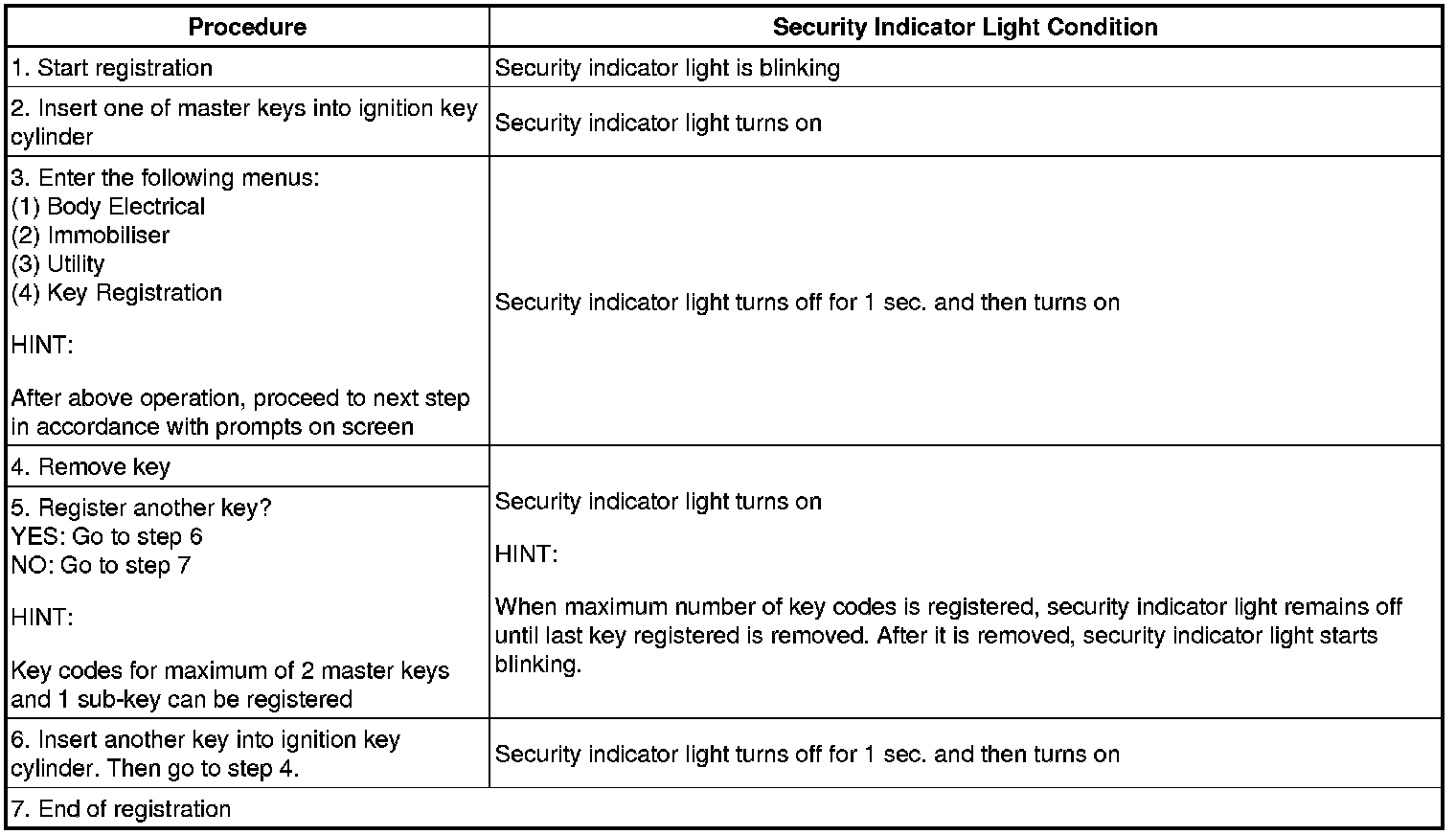 * In this mode, a maximum of 3 key codes for 2 master keys and 1 sub-key can be registered. The master keys and sub-key can be registered in any order because the transponder key ECU assembly can distinguish between different types of keys.
