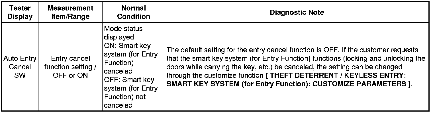 When the wireless operation can be used to lock and unlock the doors, communication between the door control receiver and certification ECU (smart key ECU assembly) is normal. If the entry lock and unlock functions do not operate, the entry cancel function may have been set to "on" through the customize function, there may be communication problems between the key and vehicle, or there may be electric wave interference.