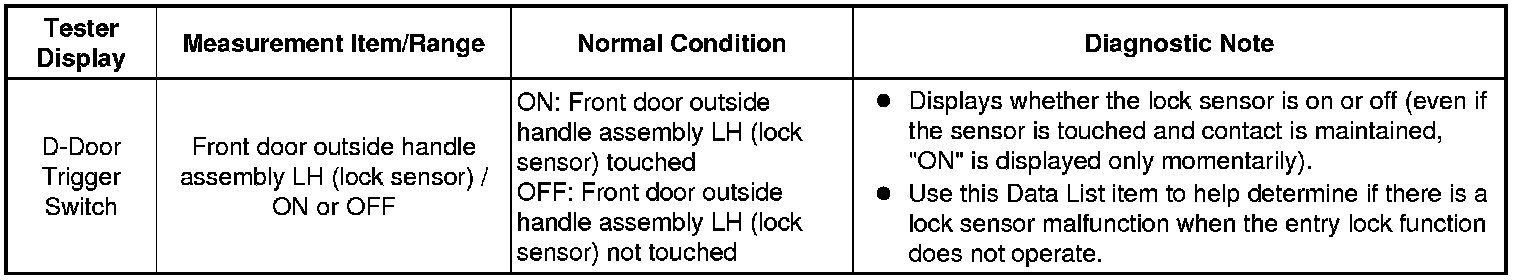 4. CHECK FRONT DOOR OUTSIDE HANDLE ASSEMBLY LH (DRIVER SIDE DOOR LOCK SENSOR SIGNAL INPUT)