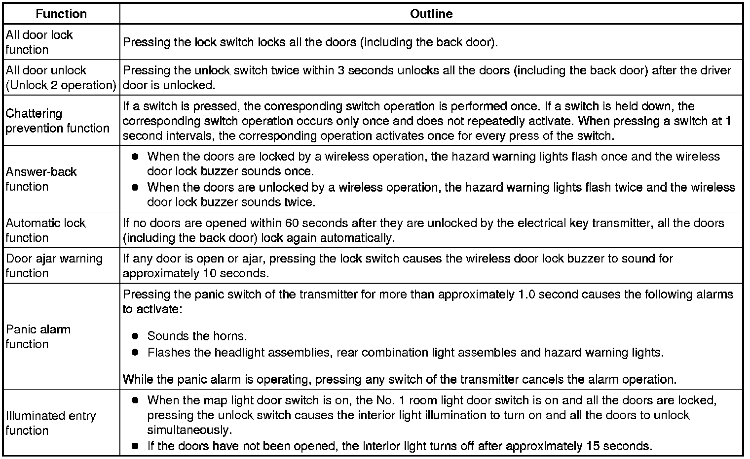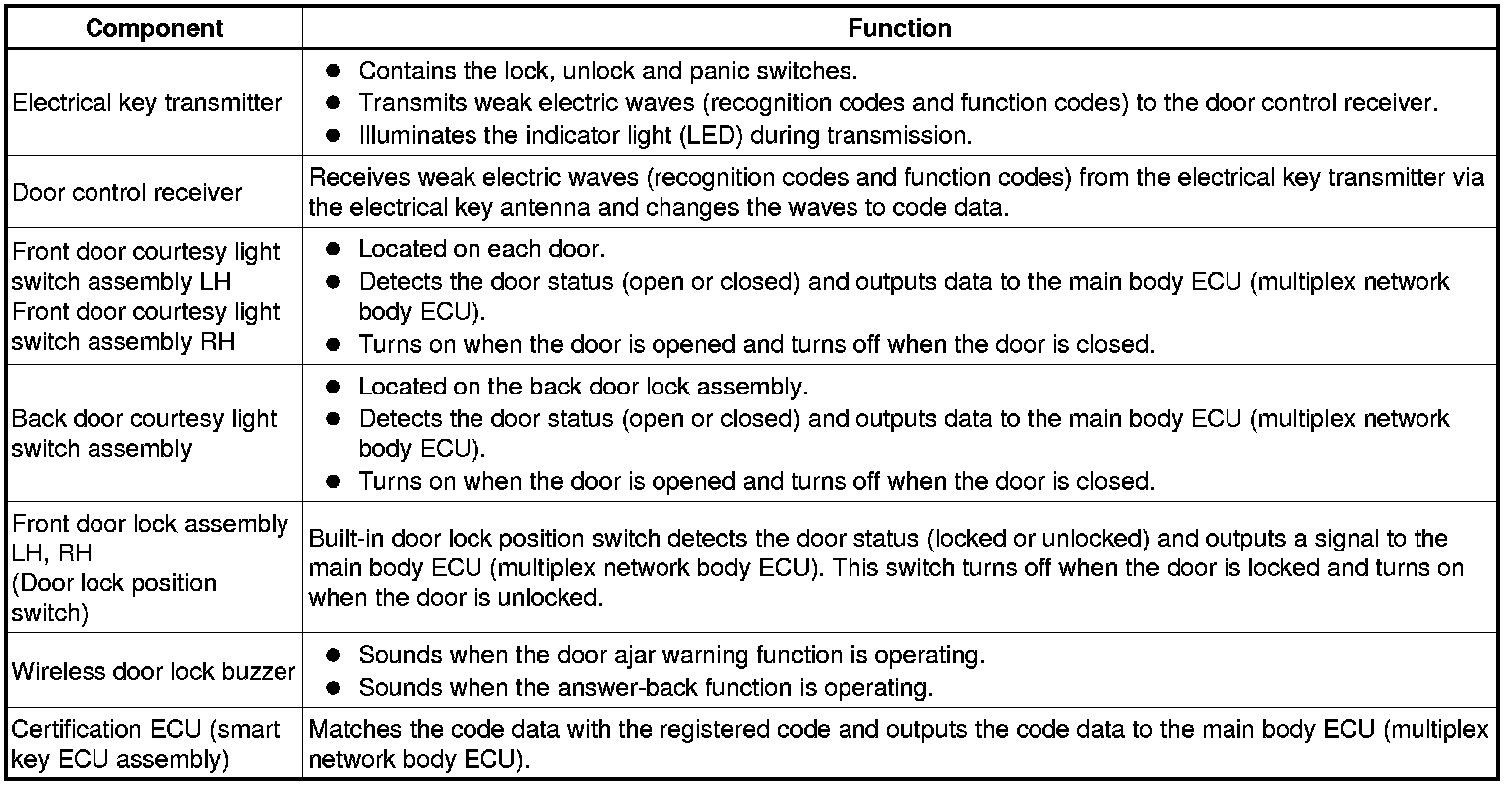 * The certification ECU (smart key ECU assembly) performs the code identification process and the main body ECU (multiplex network body ECU) controls the door locks. A serial data link is provided for communication between the certification ECU (smart key ECU assembly) and main body ECU (multiplex network body ECU).