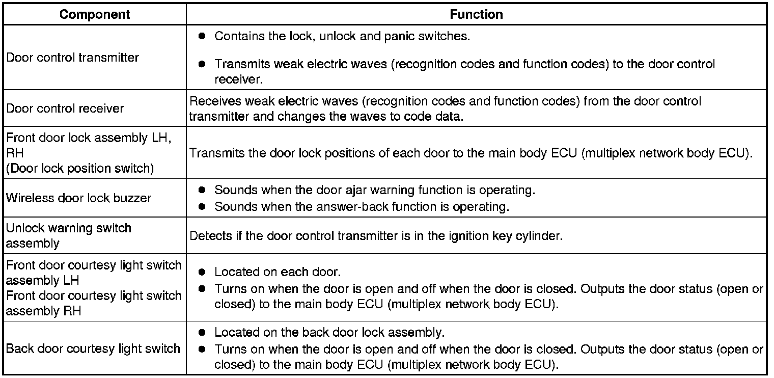 * The door control receiver performs the code identification procedure and the main body ECU (multiplex network body ECU) controls the door locks. A serial data link is provided for communication between the receiver and main body ECU (multiplex network body ECU).
