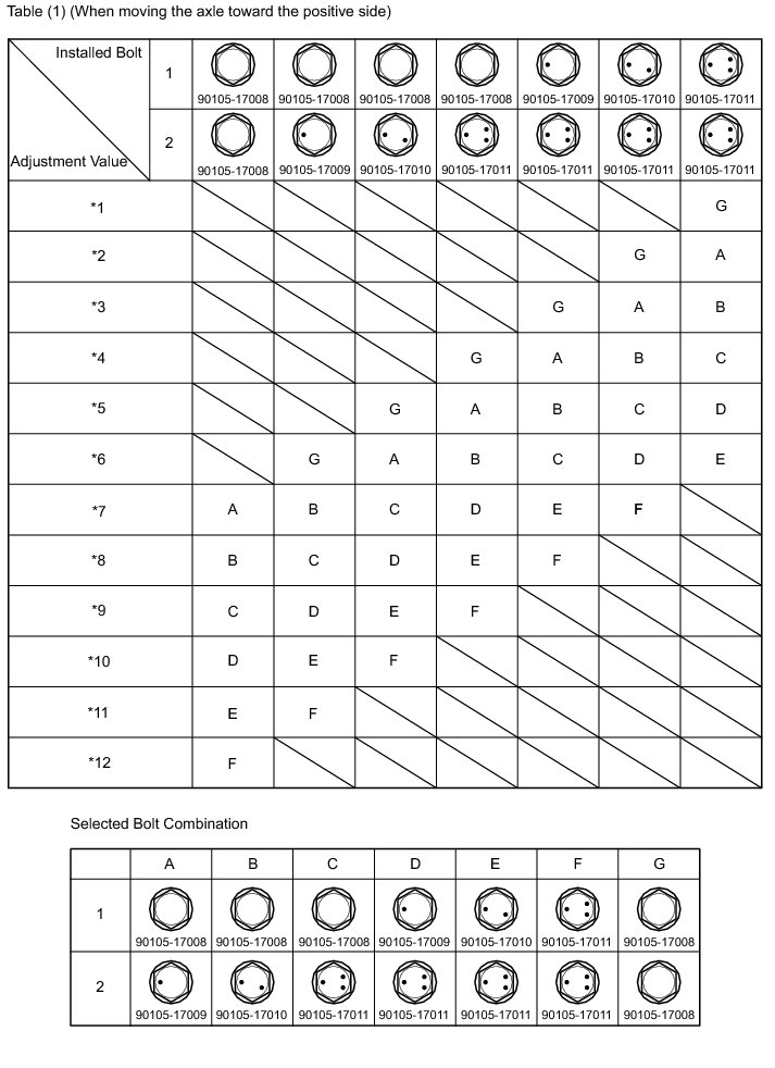 Check the combination of installed bolts. Select appropriate bolts from the table below to adjust the camber to the specified values.