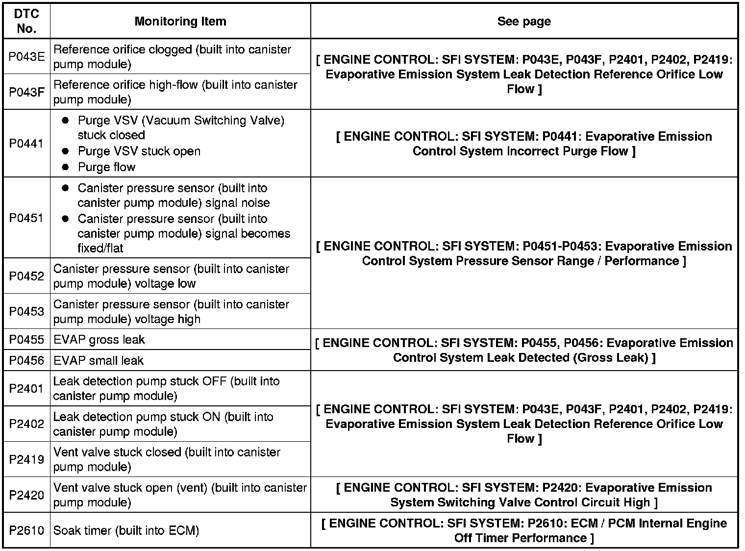 If the reference pressure difference between the first and second checks is more than the specification, all the DTCs relating to the reference pressure (P043E, P043F, P0441, P0455, P0456, P2401, P2420) will all be stored.
