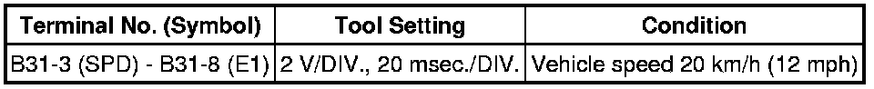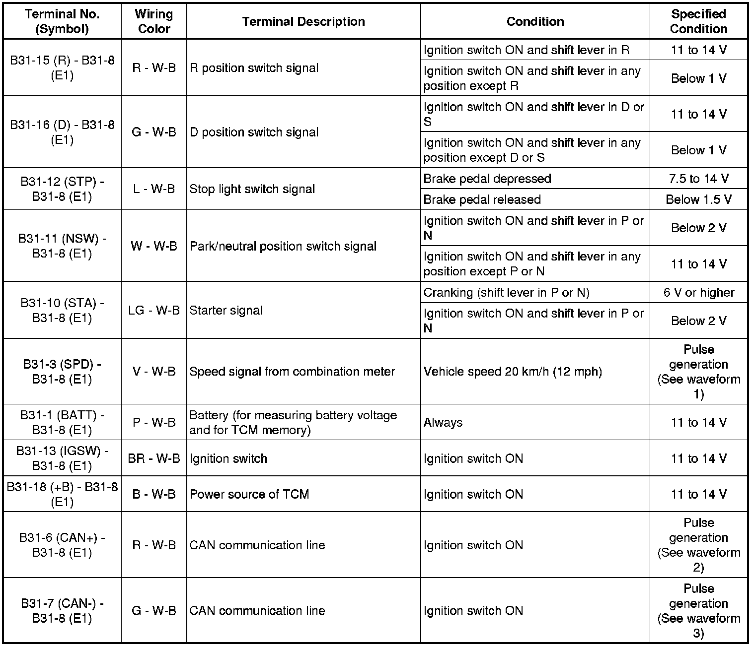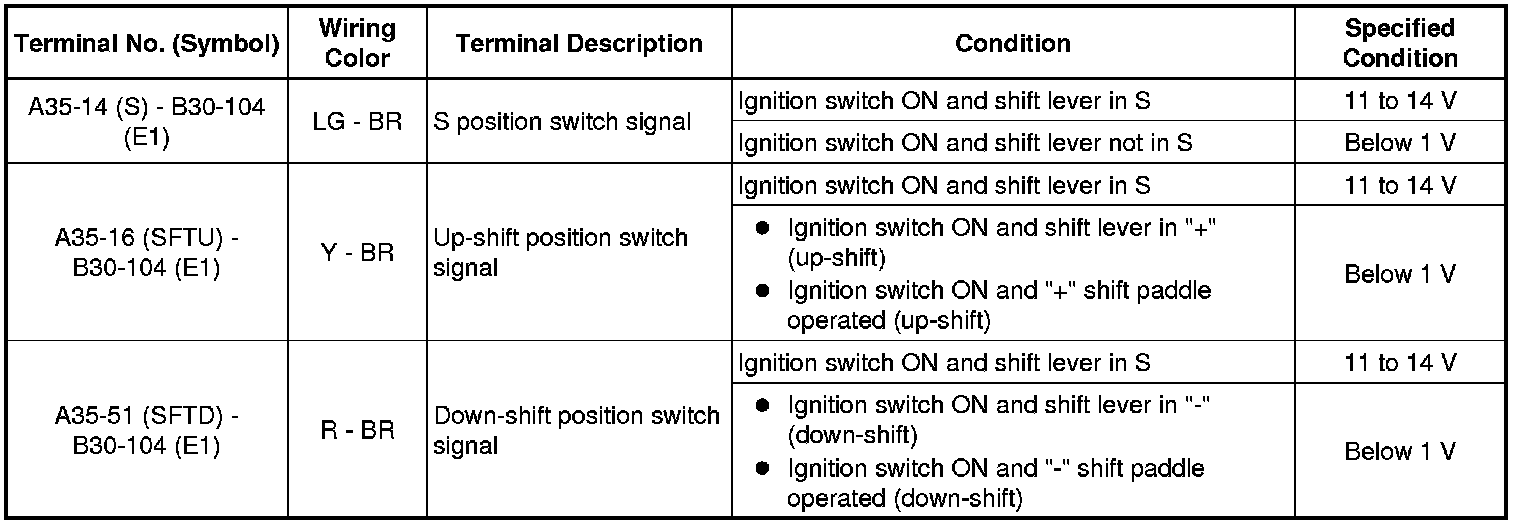 In the table, first follow the information under "Condition". Look under "Terminal No. (Symbol)" for the terminals to inspect. The standard voltage between the terminals is shown under "Specified Condition".