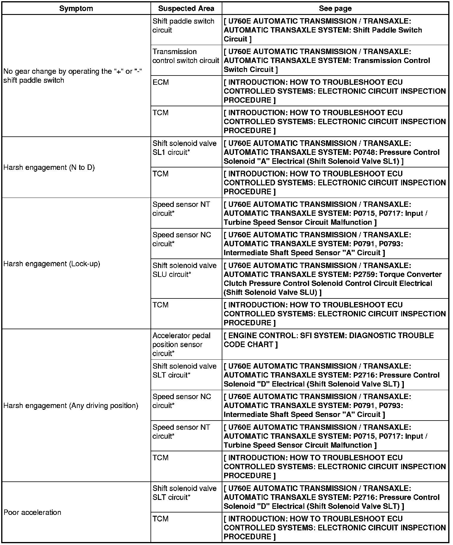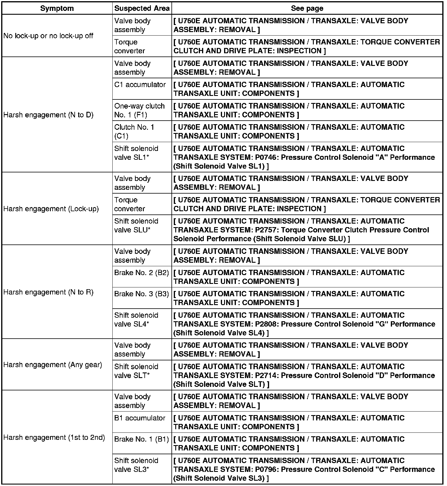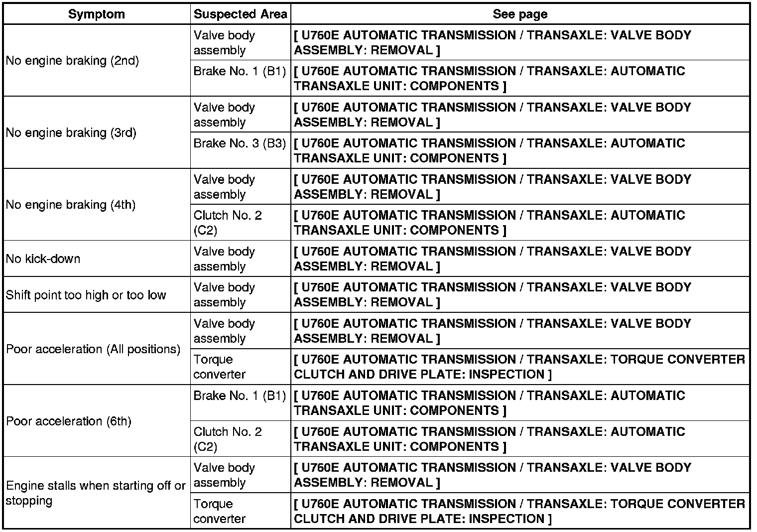 U760E AUTOMATIC TRANSMISSION / TRANSAXLE: AUTOMATIC TRANSAXLE SYSTEM: PROBLEM SYMPTOMS TABLE