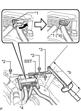 (d) Using SST and a torque wrench, tighten the 2 bolts labeled A.
