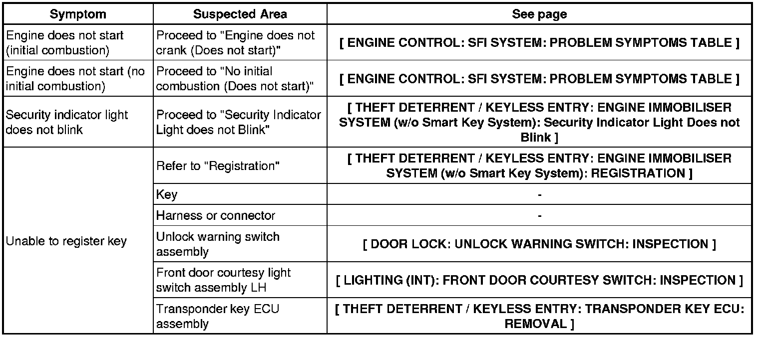 THEFT DETERRENT / KEYLESS ENTRY: ENGINE IMMOBILIZER SYSTEM (W/O Smart Key System): PROBLEM SYMPTOMS TABLE
