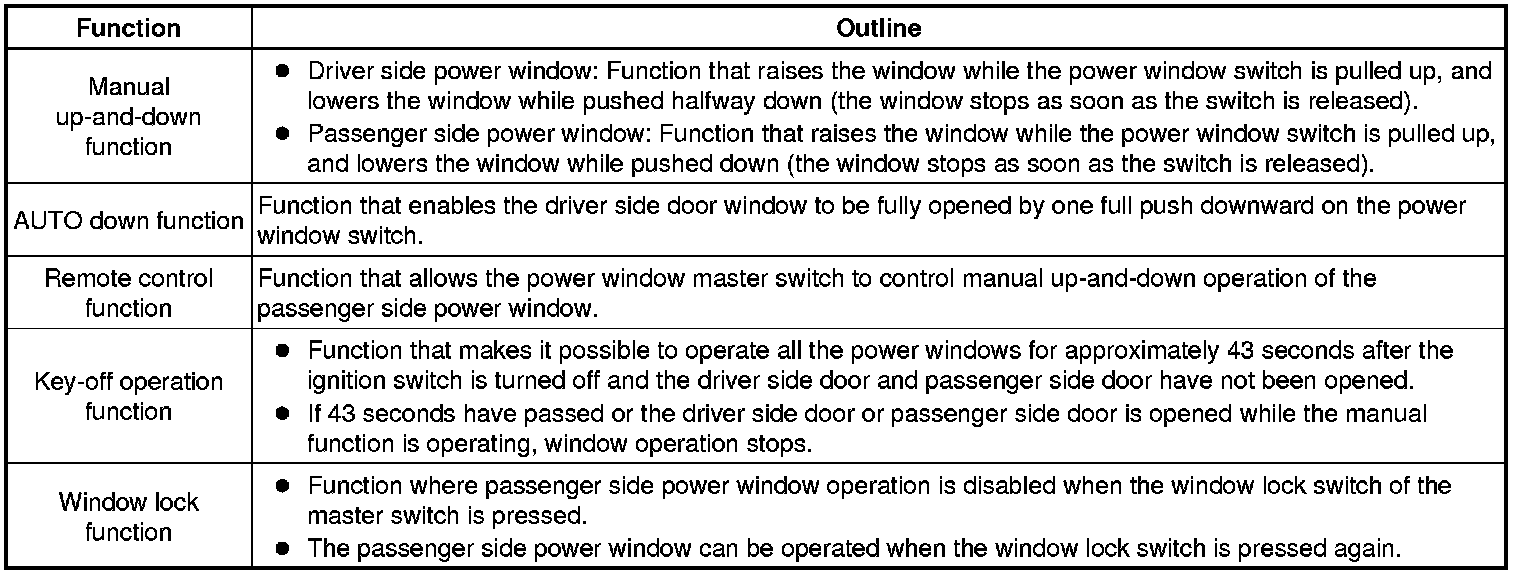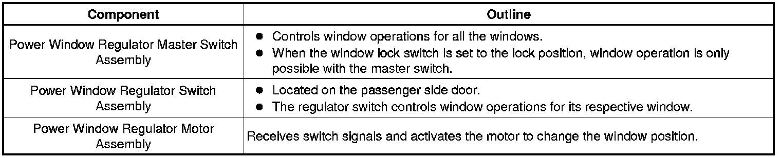 The main controls of this system are the power window regulator master switch, which is built into the driver side door, and the power window regulator switch, which is built into the passenger side door. Pressing the regulator switch or any of the switches on the master switch transmits an UP/DOWN signal to the corresponding power window regulator motor.