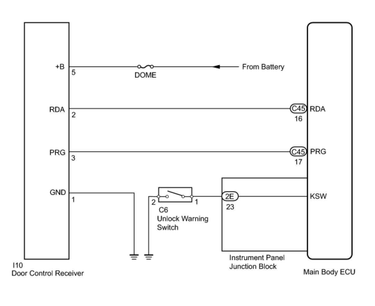 The door control receiver receives signals from the transmitter and sends these signals to the main body ECU. The main body ECU then controls all doors by sending lock / unlock signals to each door, and sends hazard flasher relay signals to the turn signal flasher relay (hazard warning lights).