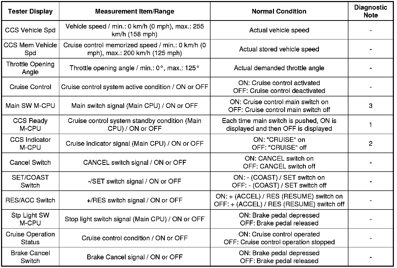 * 3 is OK but the cruise main indicator light does not illuminate -> Cruise main indicator light, wire harness, or ECM failure