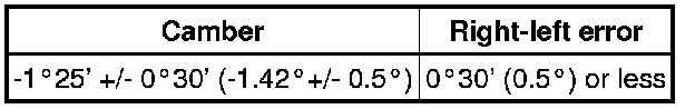 Camber is not adjustable. If the measurement is not within the specified range, inspect the suspension parts for damage and/or wear, and replace them if necessary.