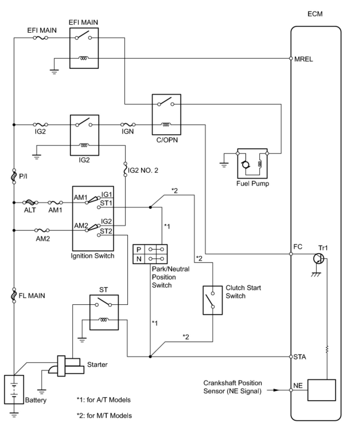 When the engine is cranked, the starter relay drive signal from the ignition switch is input into the STA terminal of the ECM, and the NE signal generated by the crankshaft position sensor is also input into the NE+ terminal. Thus, the ECM interprets that the engine is being cranked, and turns transistor Tr1 in the ECM internal circuit ON. The current flows to the C/OPN (Circuit Opening) relay by turning Tr1 ON. Then, the fuel pump operates.