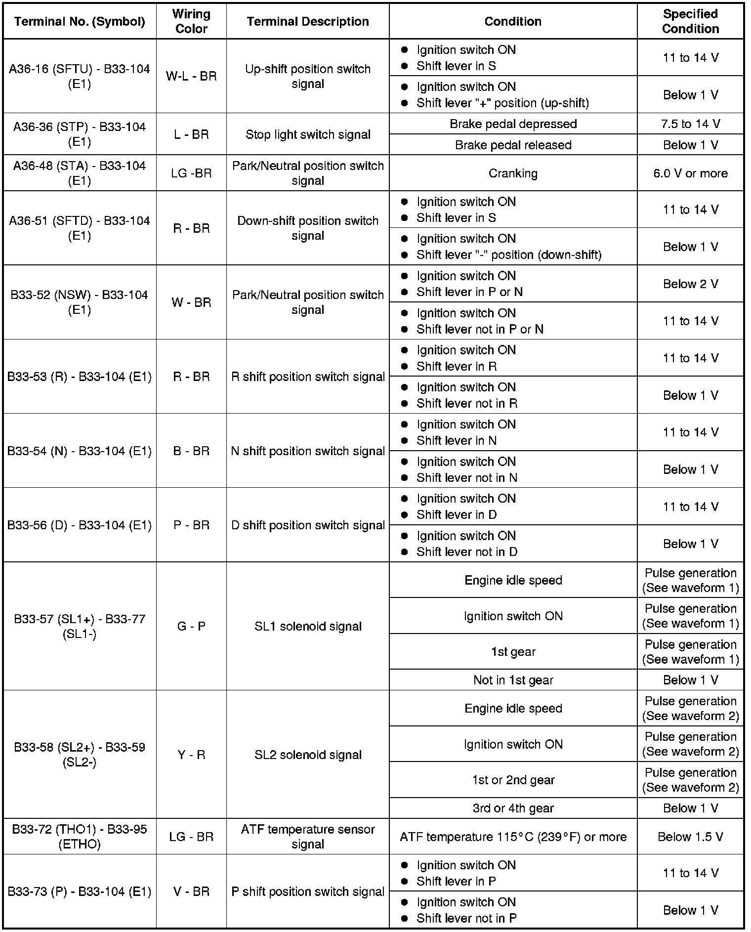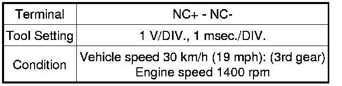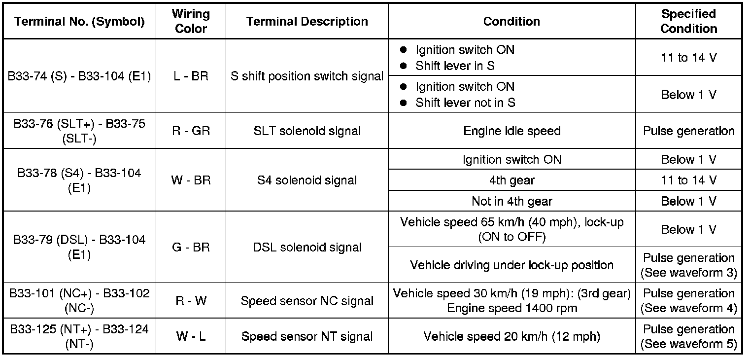 In the table, first follow the information under "Condition". Look under "Terminal No. (Symbol)" for the terminals to be inspected. The standard voltage between the terminals is shown under "Specified Condition".