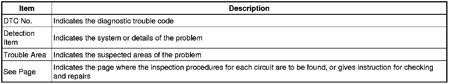 Look for output Diagnostic Trouble Codes (DTCs) (from the DTC checks) in the appropriate section's Diagnostic Trouble Code Chart. Use the chart to determine the trouble area and the proper inspection procedure. A description of each of the chart's columns are below.