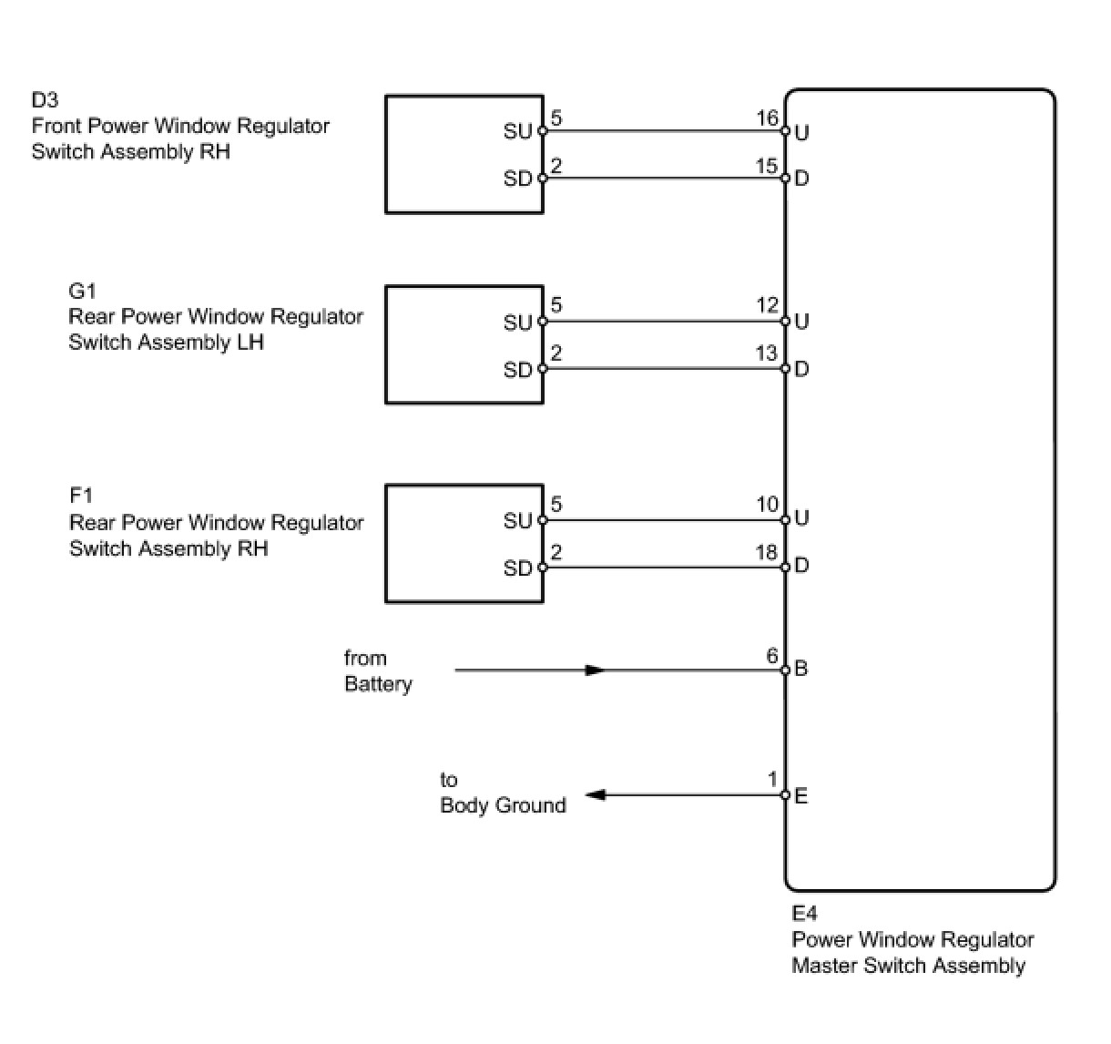 With the ignition switch ON, the power window regulator master switch transmits remote switch signals to the regulator switches of the passenger door power window and rear door power windows. Then, each regulator switch drives its respective power window regulator motor.