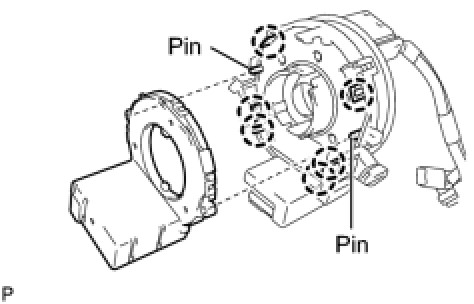 (a) Engage the 6 claws and insert the 2 pins into the holes to install the steering angle sensor onto the spiral cable.