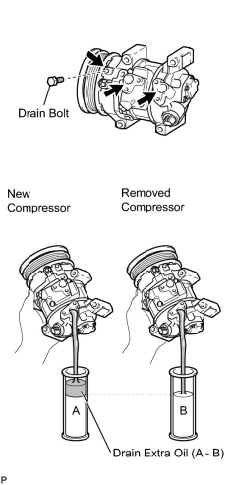 * If a new compressor is installed without removing the same amount of oil as is remaining in the vehicle pipes, the amount of oil will be too large. This prevents heat exchange in the refrigerant cycle and will cause a refrigeration failure.