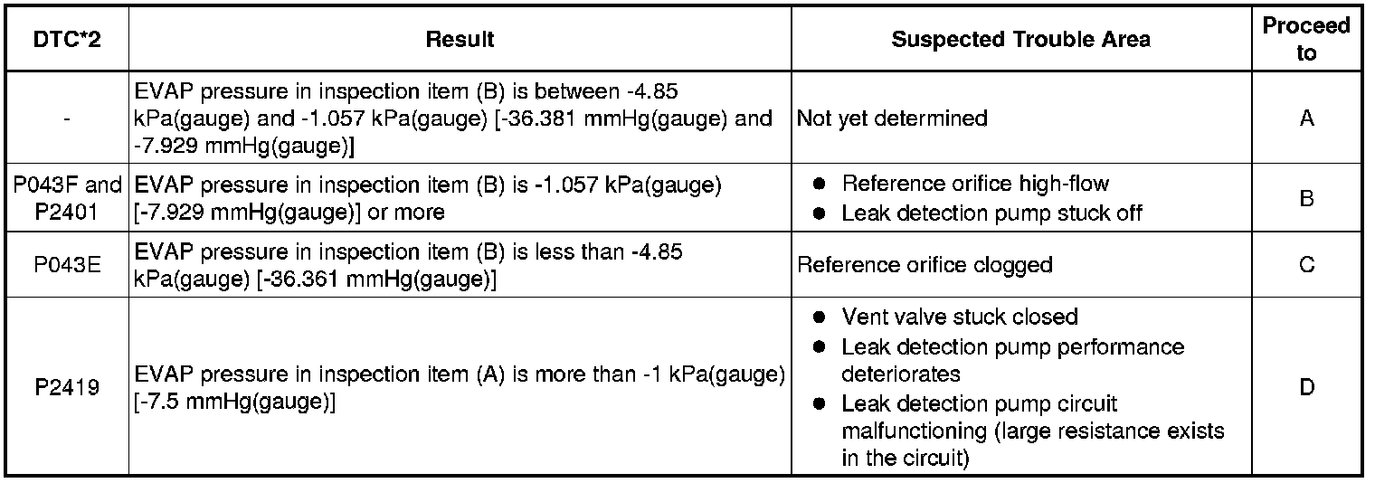 If the reference pressure difference between the first and second checks is more than the specification, all the DTCs relating to the reference pressure (P043E, P043F, P0441, P0455, P0456, P2401, P2420) will all be stored.