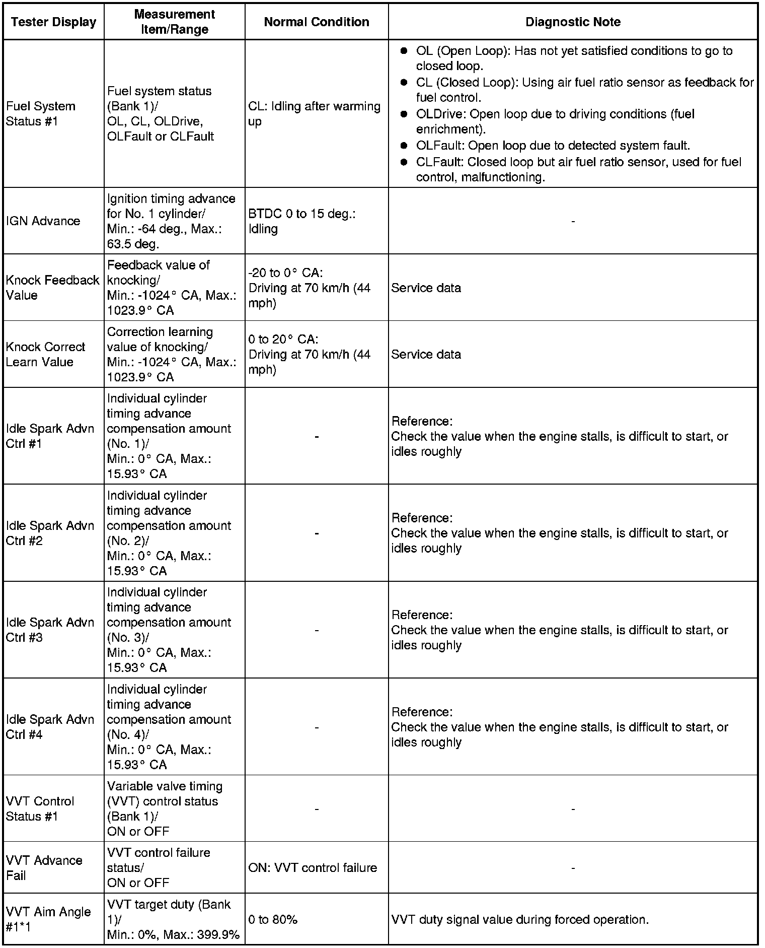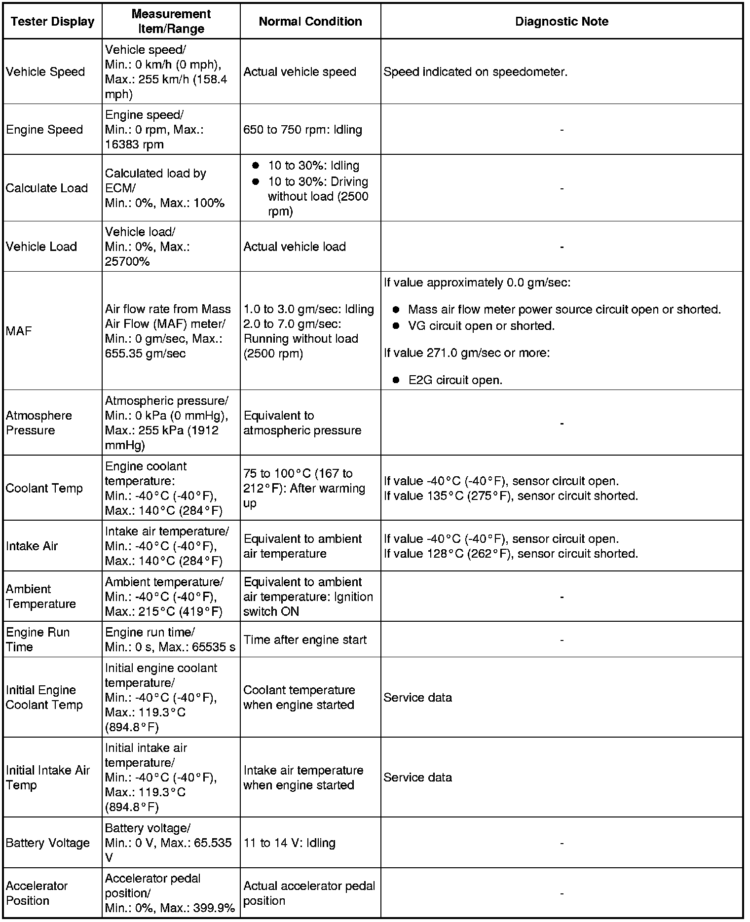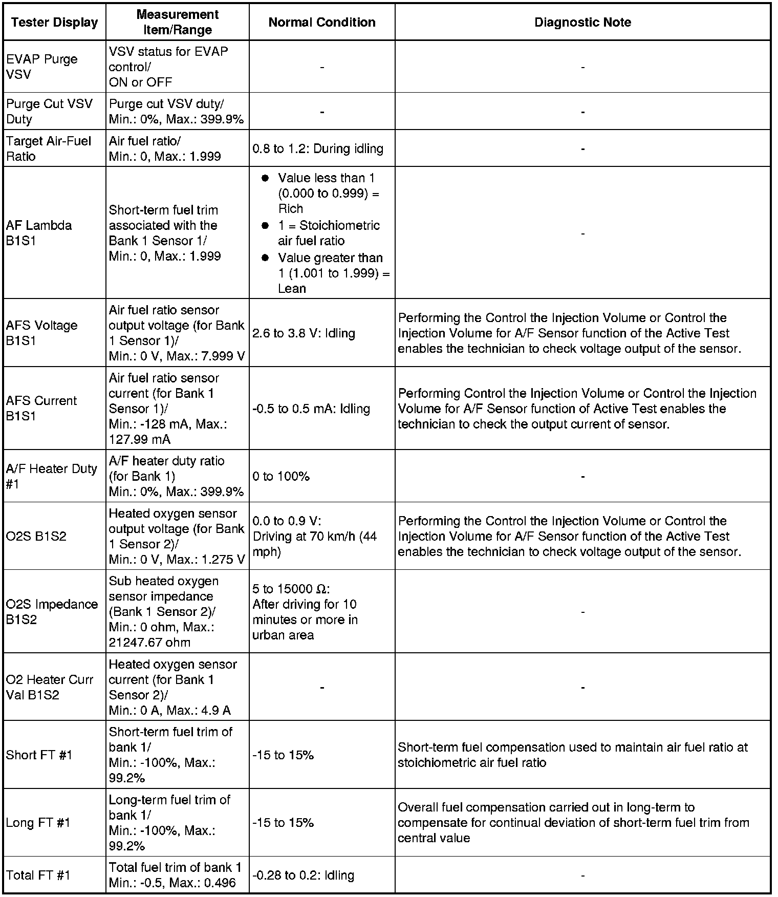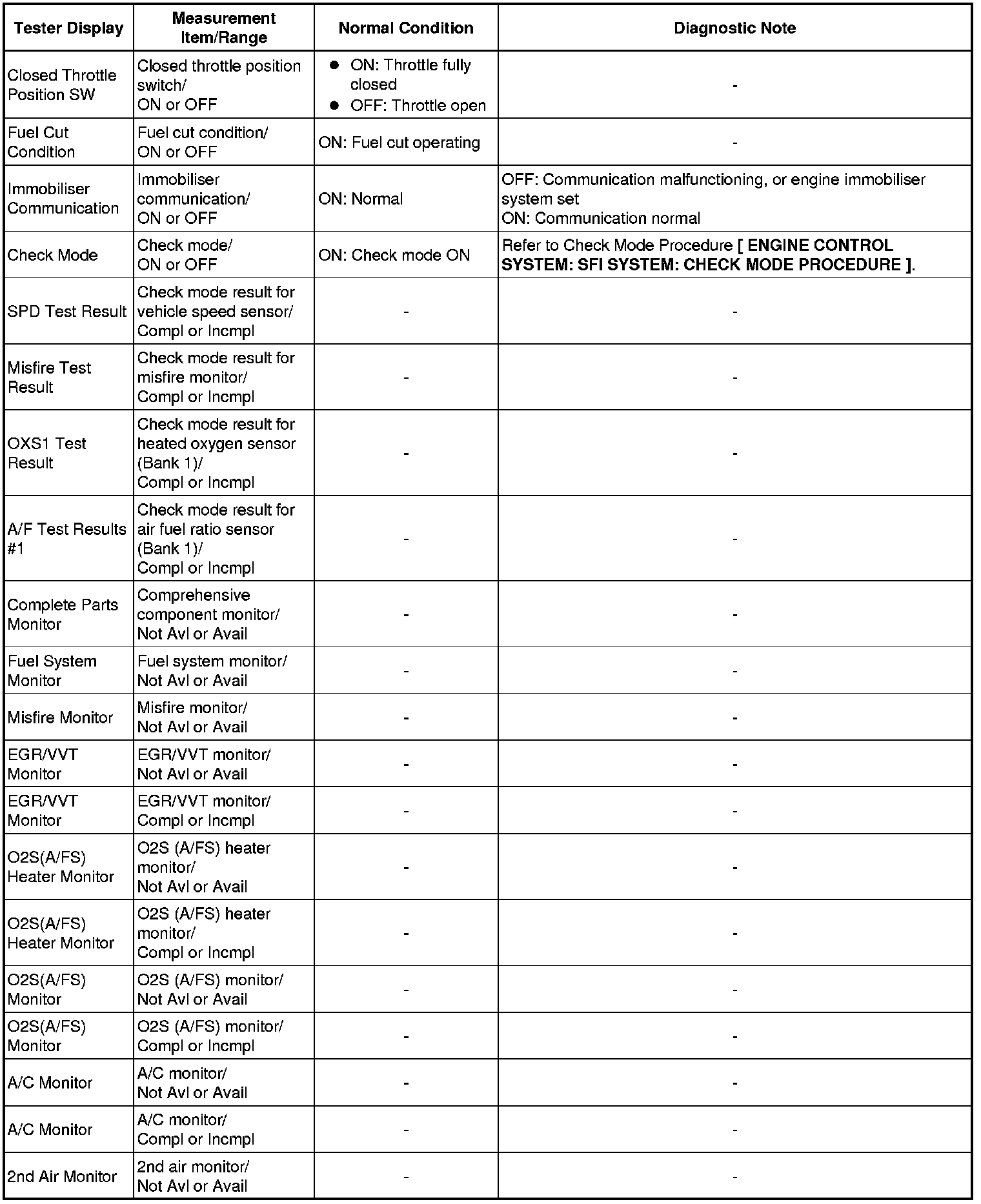 * Normal Condition: If no conditions are specifically stated for "idling", the shift lever should be in P or N (Neutral), the A/C switch should be OFF, and all accessory switches should be OFF.