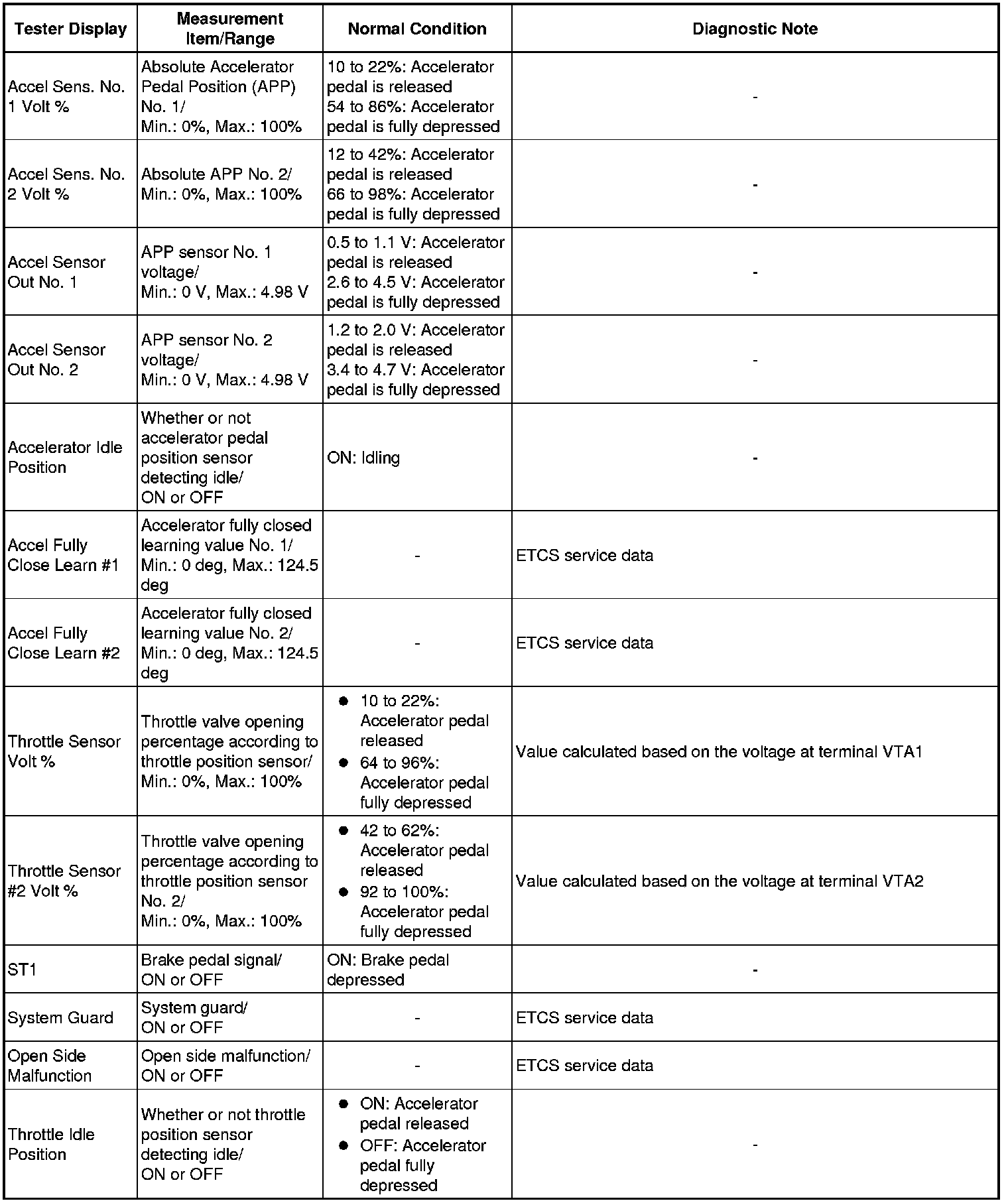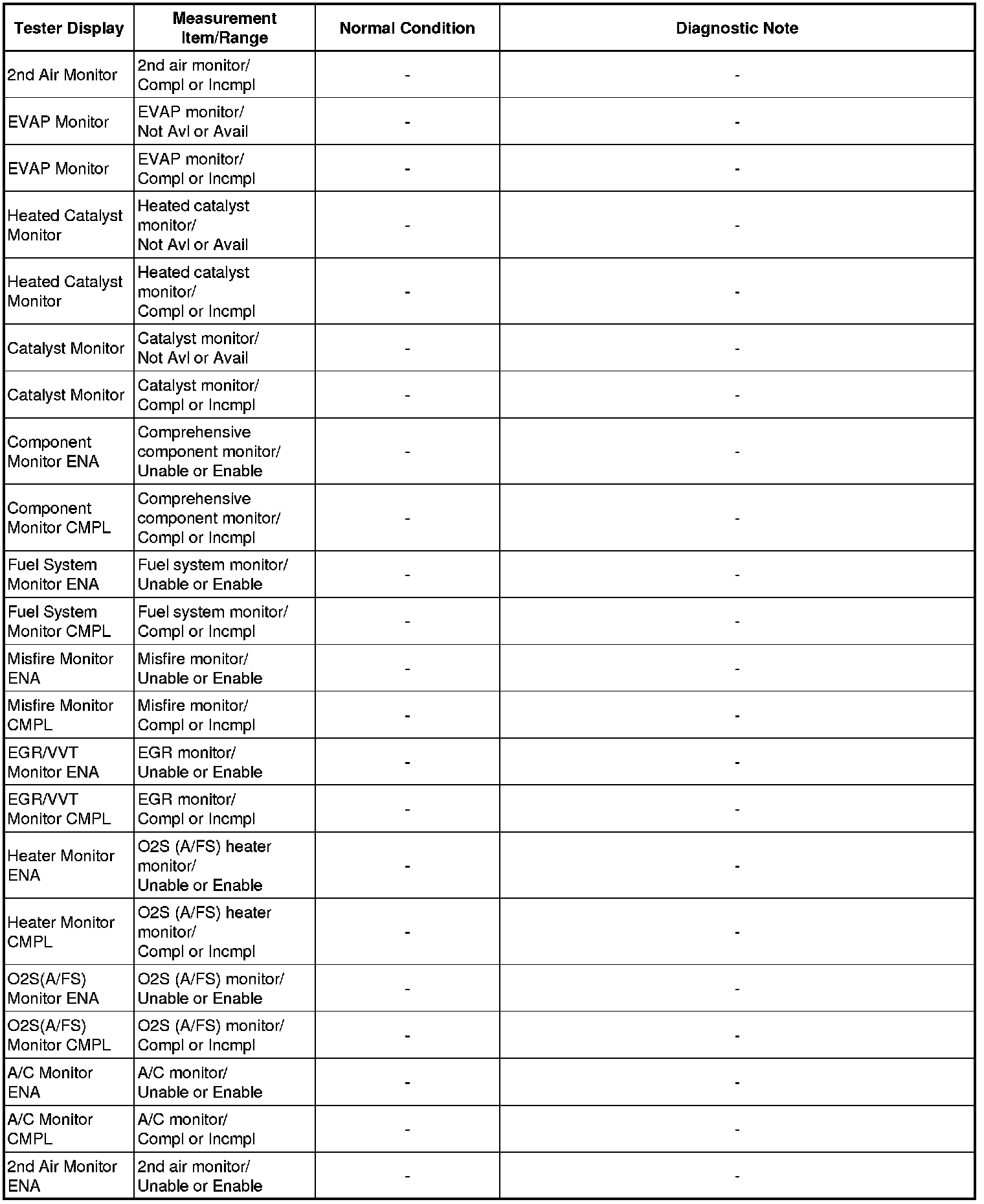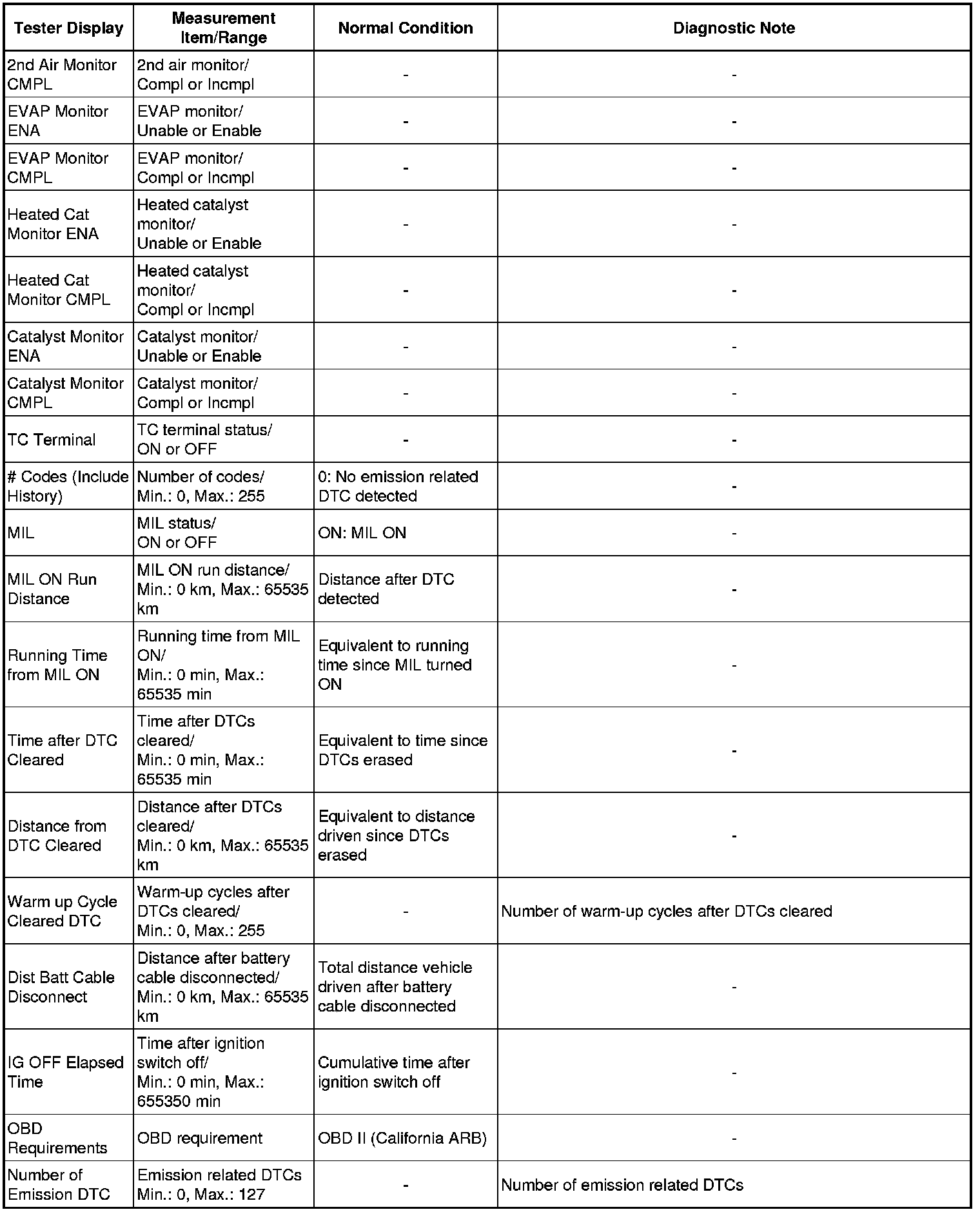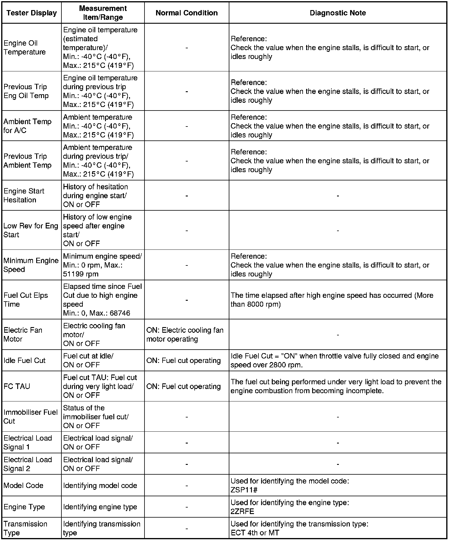 * Normal Condition: If no conditions are specifically stated for "idling", the shift lever should be in P or N (Neutral), the A/C switch should be OFF, and all accessory switches should be OFF.