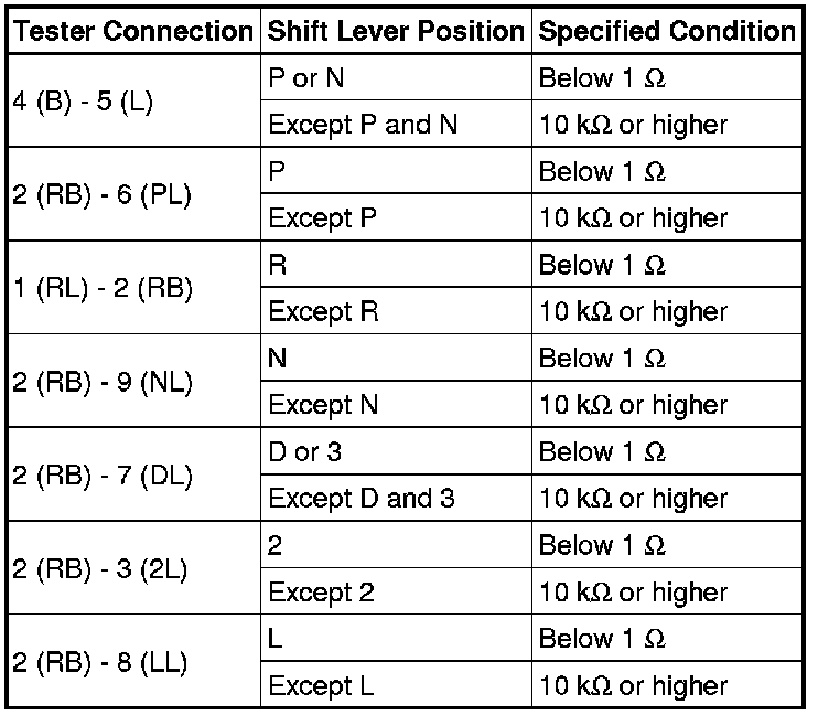 If the resistance is not as specified, replace the park/neutral position switch assembly.