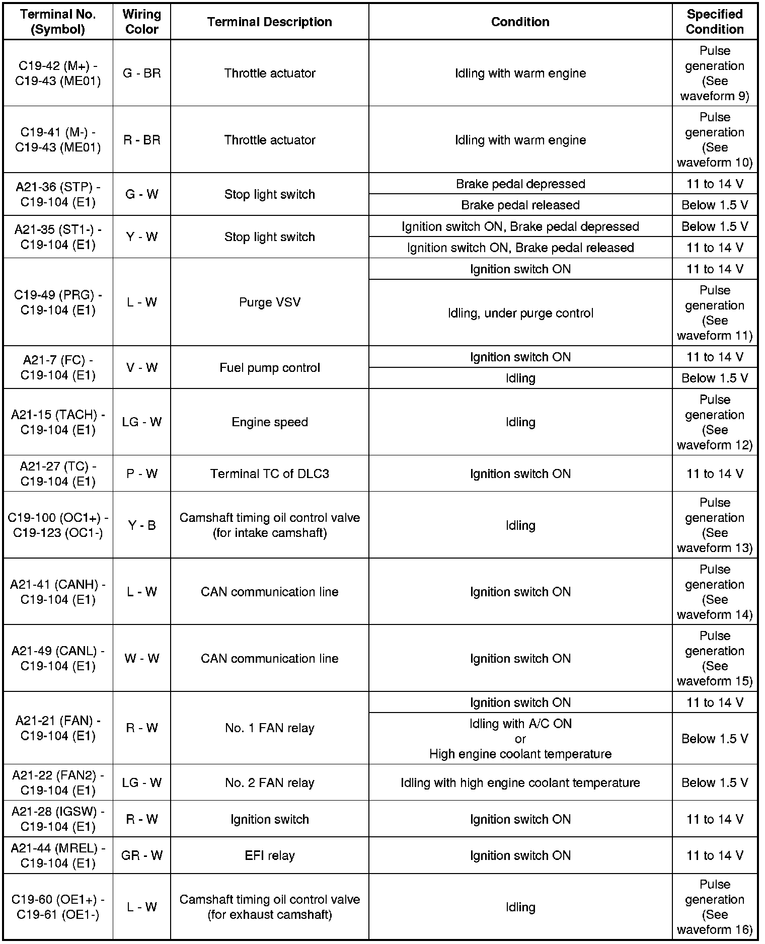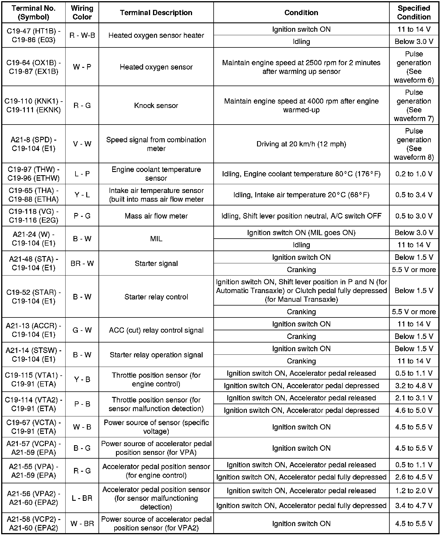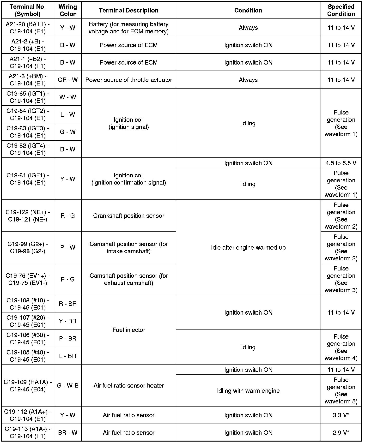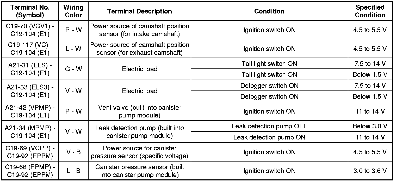 The standard normal voltage between each pair of the ECM terminals is shown in the table below. The appropriate conditions for checking each pair of the terminals are also indicated. The result of checks should be compared with the standard normal voltage for that pair of the terminals, and displayed in the "Specified Conditions" column. The illustration above can be used as a reference to identify the ECM terminal locations.