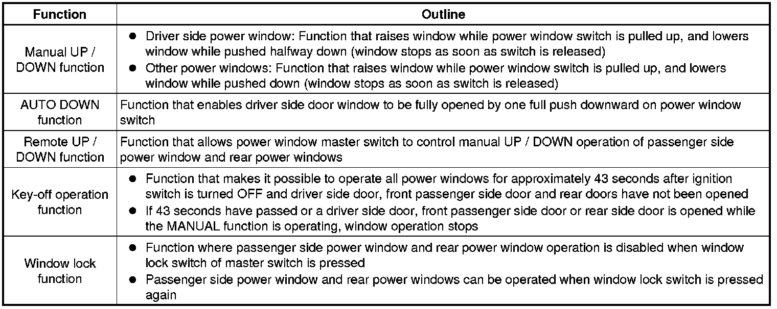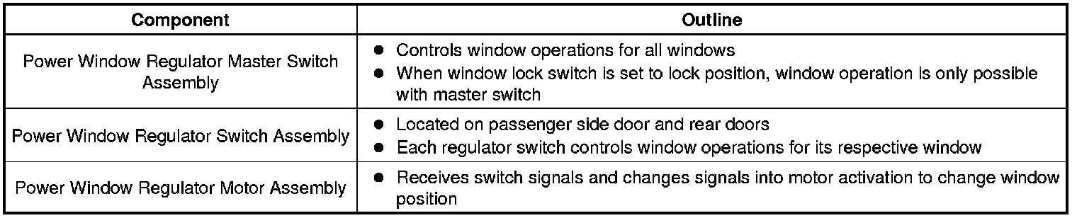 The main controls of this system are the power window regulator master switch, which is built into the driver side door, and the power window regulator switches, which are built into the passenger side door and rear doors. Pressing the regulator switch or any of the switches on the master switch transmits an UP / DOWN signal to the corresponding power window regulator motor.
