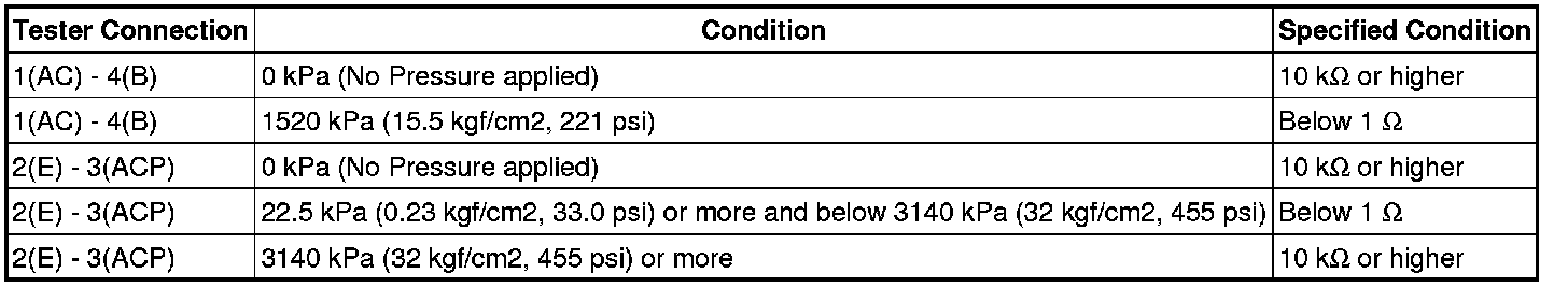 (2) Apply pressure on the sensor as indicated in the table below, and check the resistance between the terminals.