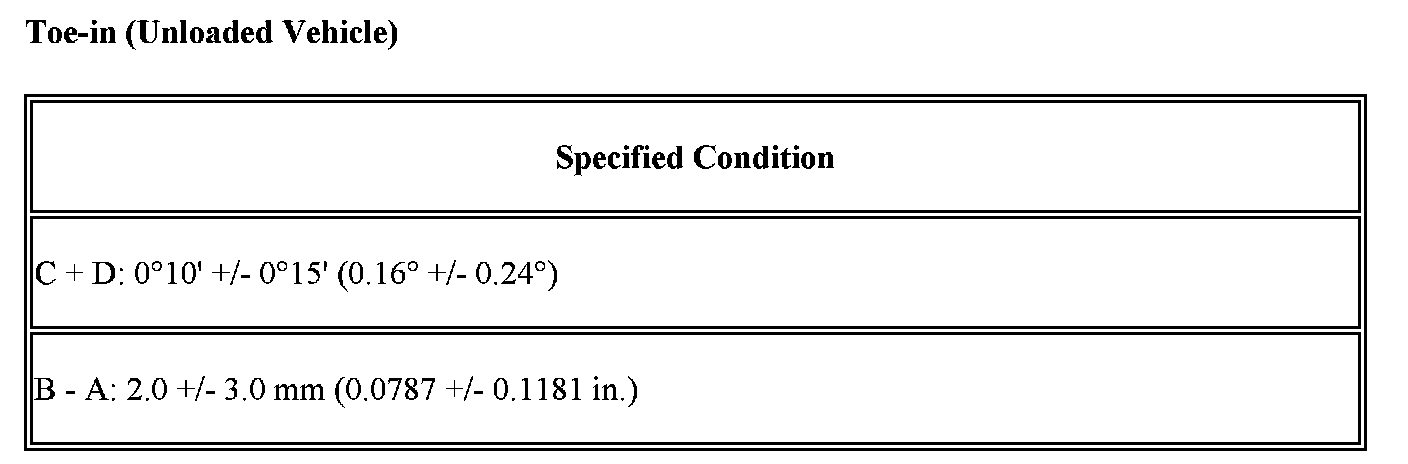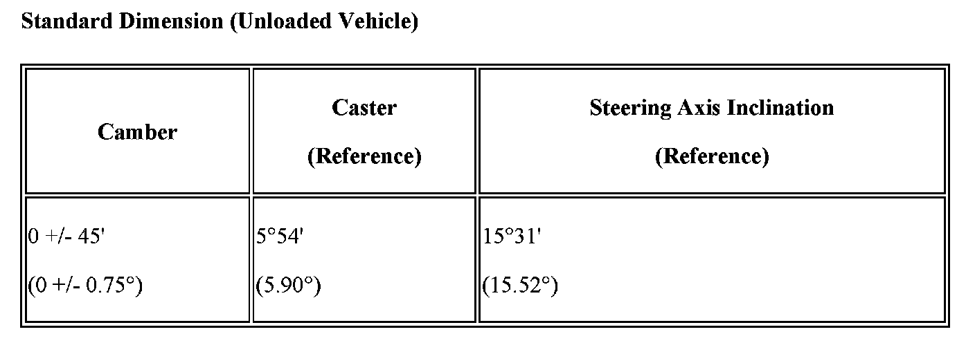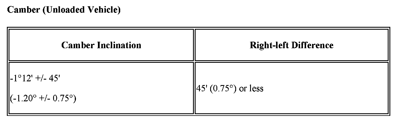 - The tolerance for the difference between the left and right wheels is 45' (0.75°) or less for both the camber.
