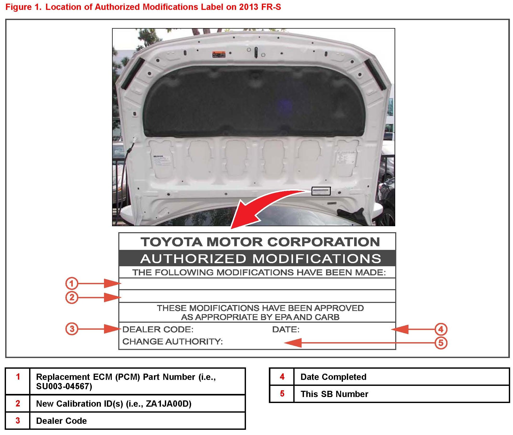 2. Check for the Authorized Modifications Label affixed to the vehicle in the location shown in Figure 1. Confirm if the ECM (PCM) calibration has been updated. If the calibration ID listed is NOT the latest ECM (PCM) calibration - go to step 3.