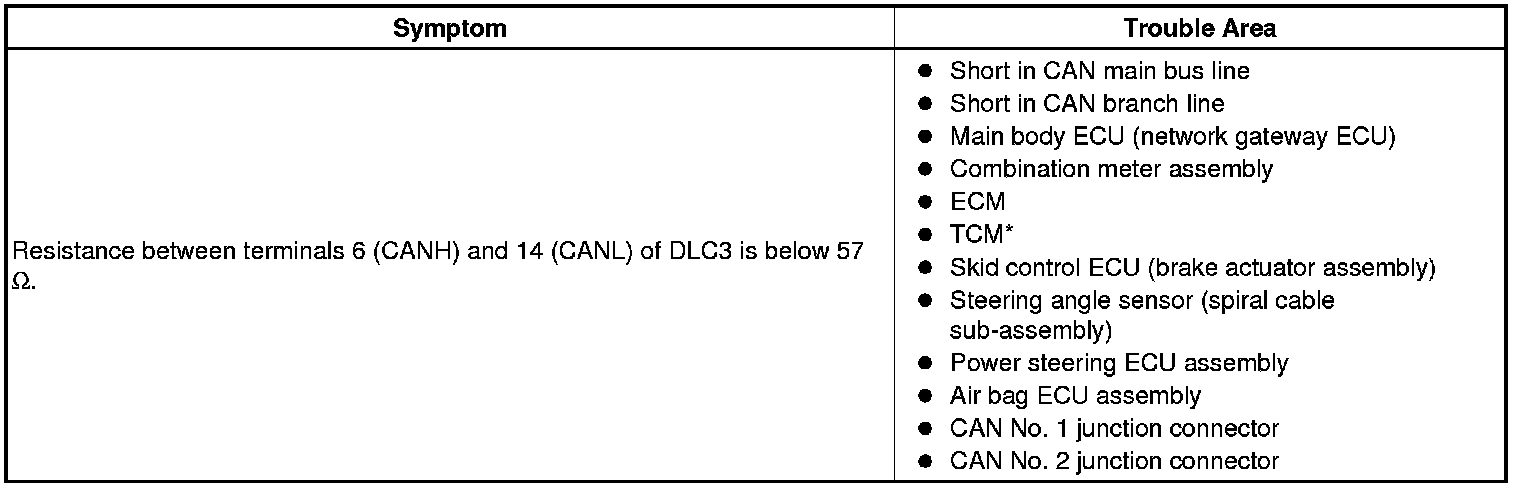 There may be a short circuit between the V bus main lines and/or CAN branch lines when the resistance between terminals 6 (CANH) and 14 (CANL) of the DLC3 is below 57 Ohms.