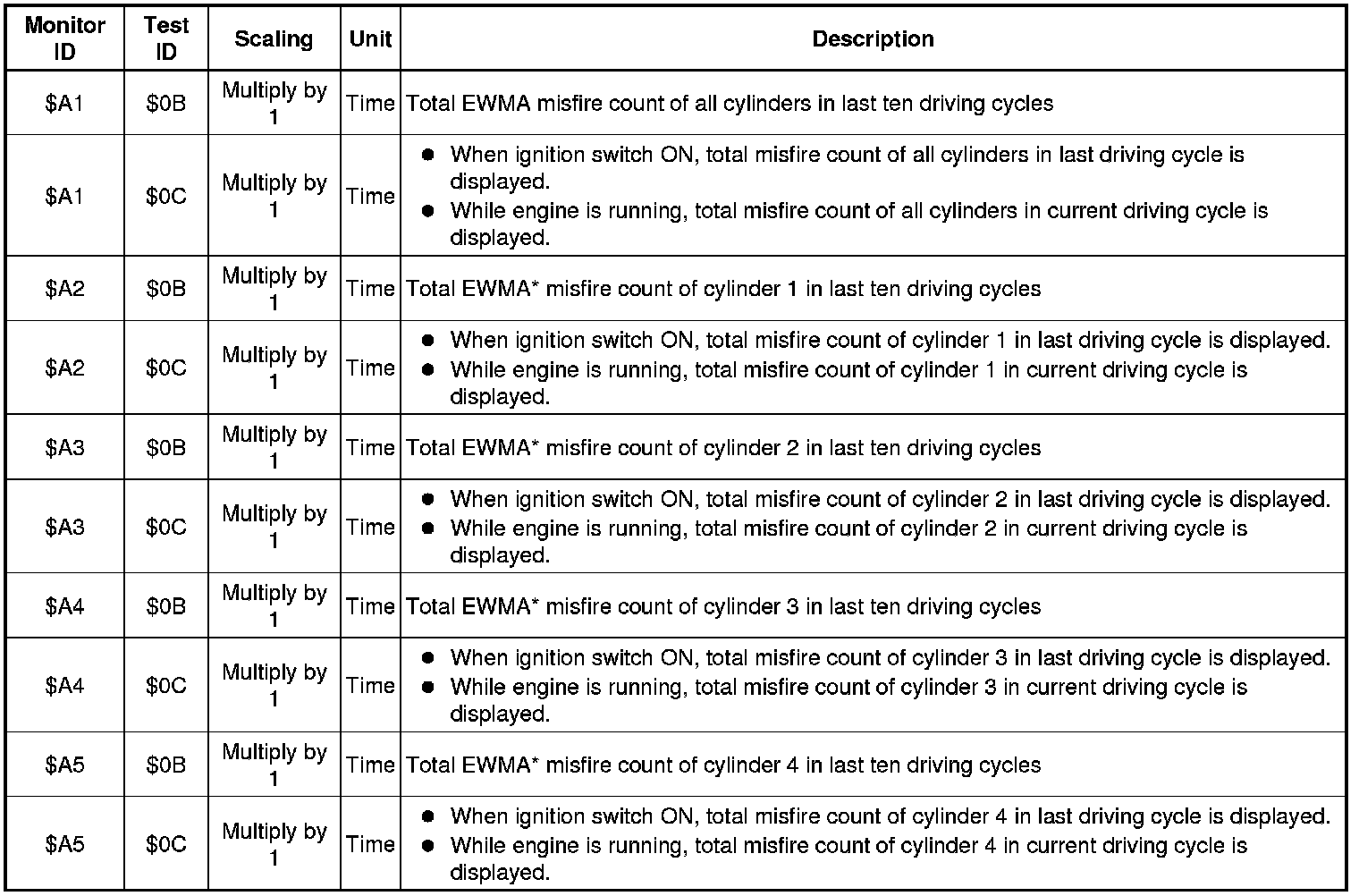 *: EWMA (Exponential Weighted Moving Average) misfire counts for last 10 driving cycles (calculated) Calculation: 0.1 x (current counts) + 0.9 x (previous average) Initial value for (previous average) = 0