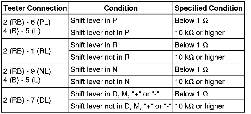 If the result is not as specified, replace the park/neutral position switch assembly.