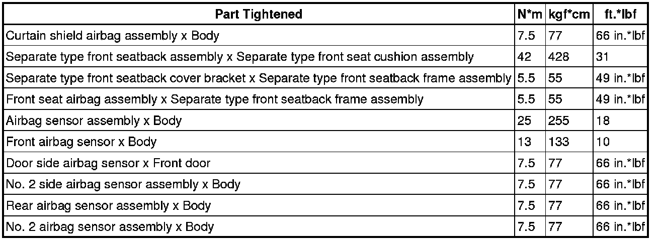 SPECIFICATIONS: SUPPLEMENTAL RESTRAINT SYSTEMS: TORQUE SPECIFICATIONS; 2013 MY FR-S [03/2012 -]
