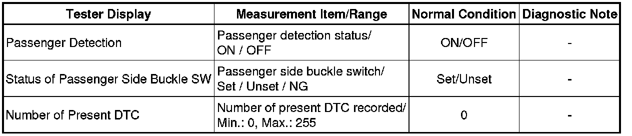 SUPPLEMENTAL RESTRAINT SYSTEMS: OCCUPANT CLASSIFICATION SYSTEM: DATA LIST / ACTIVE TEST; 2013 MY FR-S [03/2012 -]