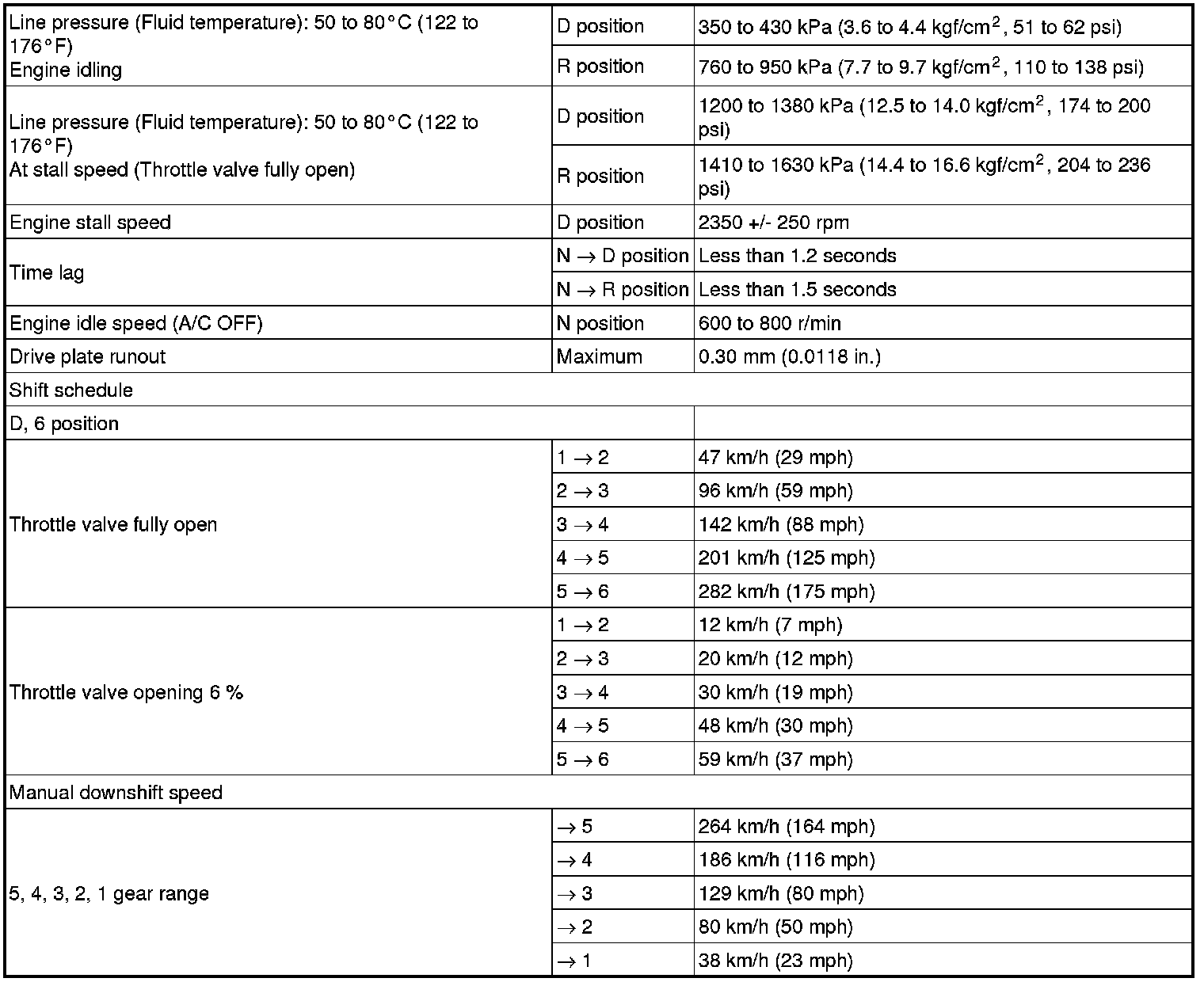 * All shift point values indicated in the above tables are actual values. Therefore, if checking a shift point with a chassis dynamometer, keep in mind that there is a range of error in the chassis dynamometer indication.