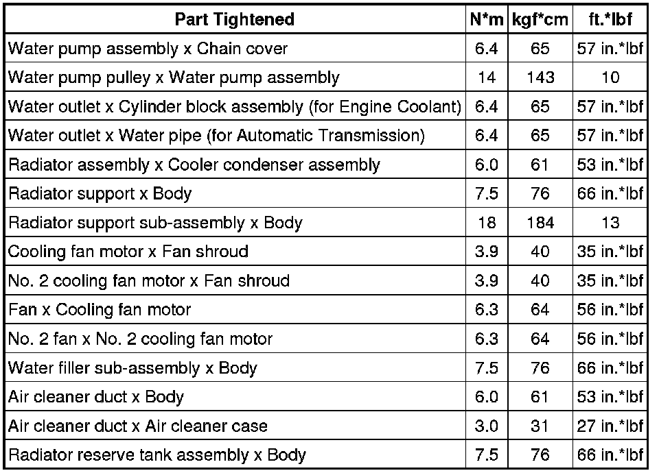 SPECIFICATIONS: FA20 COOLING: TORQUE SPECIFICATIONS; 2013 MY FR-S [03/2012 -]