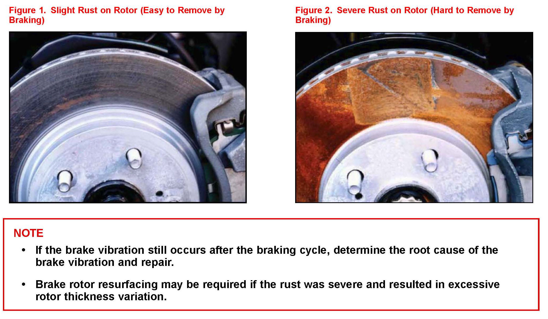 The brake rotors are made of cast iron so they may show gradual build-up of surface rust during long-term storage. At least once every two months drive the vehicle and use the brakes normally stopping from about 30 mph at least 20 times. This regular usage will help prevent severe rust build up and the possibility of unwanted brake vibration concerns due to rust.