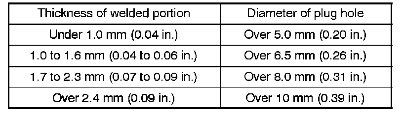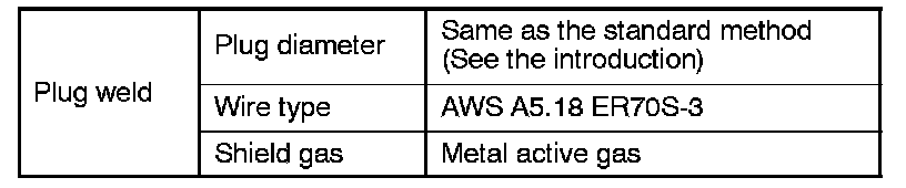 NOTICE: Be sure to use Metal active gas (Ar 80% + CO2 20%) as the shield gas when plug welding. Sufficient weld strength cannot be assured when using 100% CO2 shield gas.