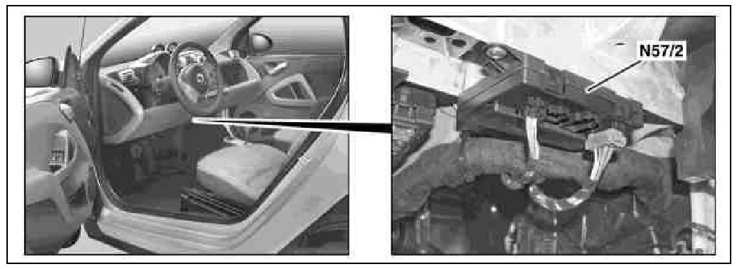 The power window convenience feature control unit takes over the control of the side windows. The control unit monitors the power consumption of the connected loads and thereby recognizes lockup or the limit stop of the side window.