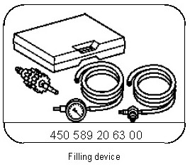 6 Carefully open the shutoff lever (3) until the hose ( 8) at the filling device (5) is filled with coolant.