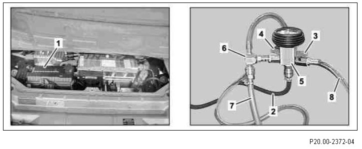 5 Open shutoff lever (4) until the pointer on the filling device (5) is located in the green area (- 0.85 to - 0.9 bar). Then evacuate cooling system for just another 2 minutes or so.